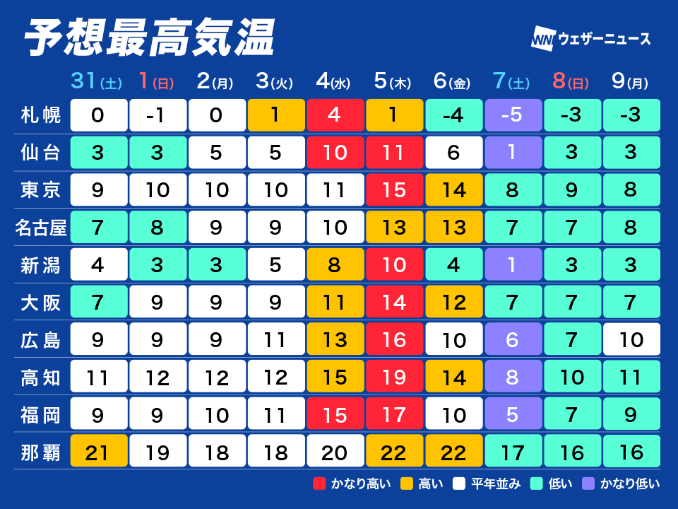 次の週末の7日(土)は強い寒気が南下する予想で、一気に気温が下がります。札幌市の最高気温は−5°Cの厳しい寒さで、西日本や東日本も一桁の所がほとんどです。