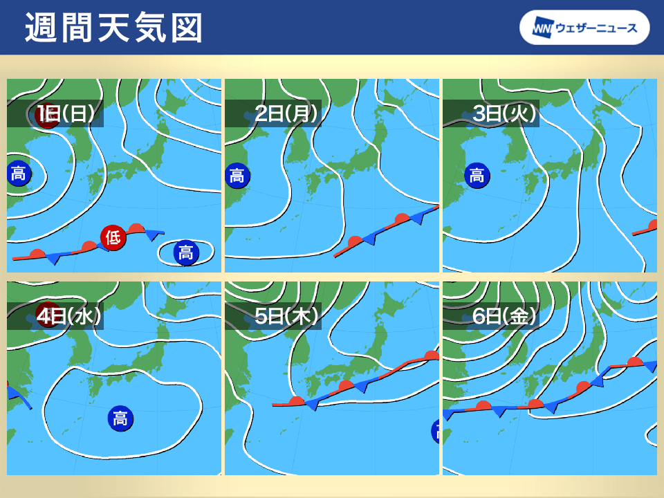来週中頃以降は、本州南岸に前線が停滞する見込みです。このため、太平洋側でも雲が広がりやすくなります。洗濯物の外干しでカラッと乾かしたい場合は、日差しが届きやすい来週前半までが良さそうです。