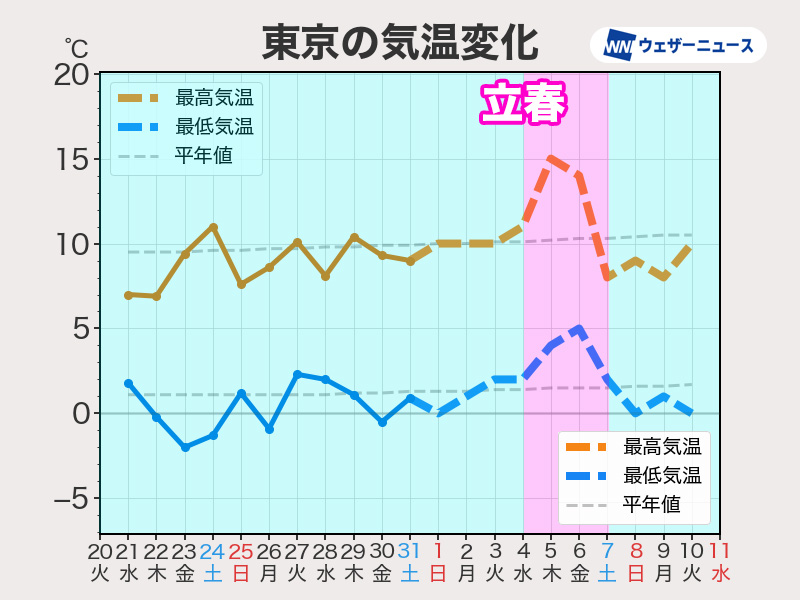 2月4日の二十四節気「立春」の頃には、強い寒気が北へ後退し、日中は春を感じる暖かさとなる所もあるとみています。ただ、朝晩は冷え込みますので、脱ぎ着しやすい服装で体感温度を調節してください。