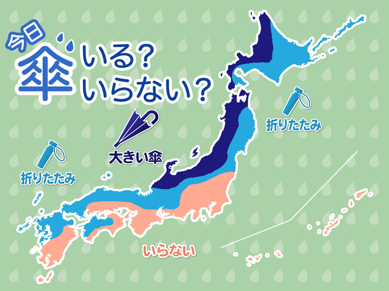 北日本の太平洋側や東海西部、西日本の日本海側も雪や雨の可能性があります。晴れていても油断せず、外出には折りたたみ傘を持っておいた方が安心です。