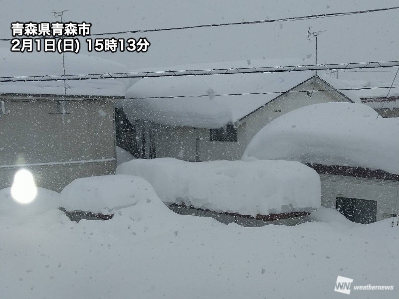 青森市では昼前から昼過ぎにかけて非常に活発な雪雲が通過して、1時間で7cm積雪が増加した時間がありました。また、15時までの3時間降雪量(雪の強さに相当)は16cmで、2月としては2005年2月11日に並んで観測史上1位タイの記録となりました。17時現在は雪は小康状態となっていますが、積雪深(地面からの雪の厚み)は180cmを超えています。