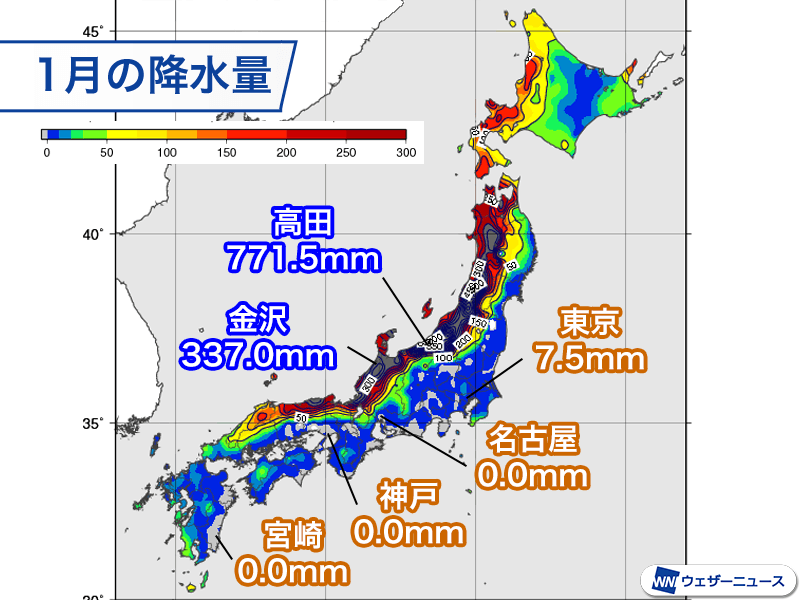 1月は冬の天気分布が顕著に 太平洋側は広範囲で降水量0.0mm