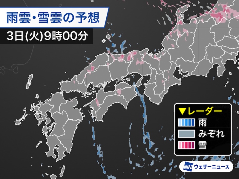 関西や瀬戸内は午前中ににわか雪や雨