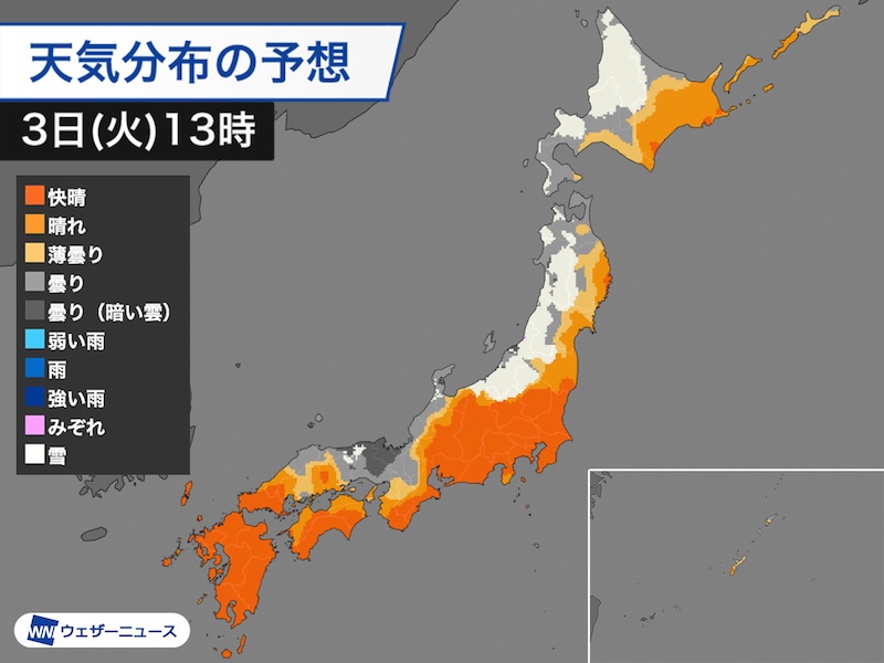 北日本・東日本太平洋側や九州は、晴れて青空が広がります。空気の乾燥が続くため、保湿や火の元の管理に引き続き注意をしてください。