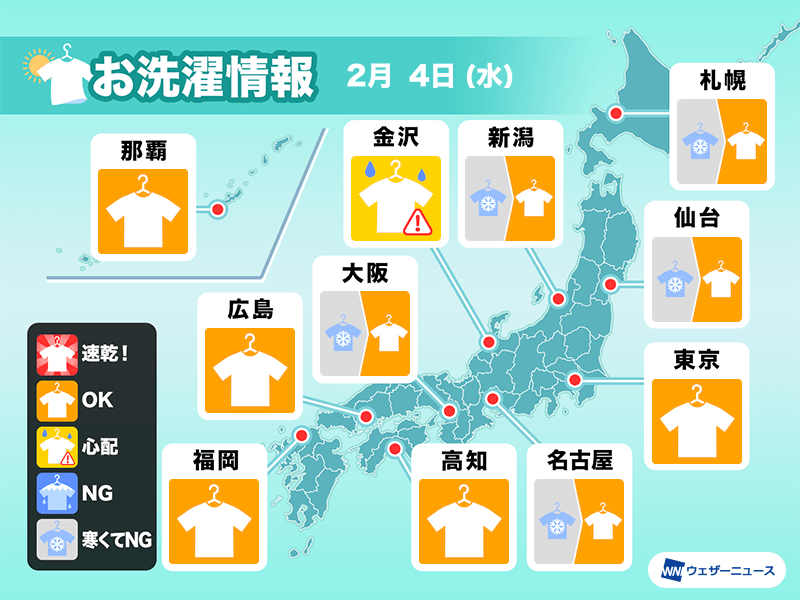 立春の今日は広い範囲で穏やかな天気となり、太平洋側を中心に洗濯日和となります。シーツなど大物を干すのも良さそう。