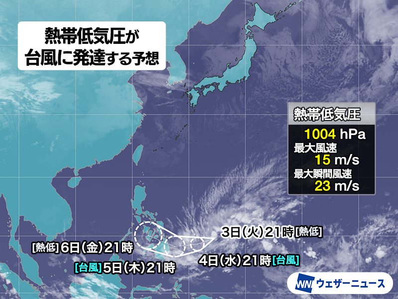 今日3日(火)9時に発生したこの熱帯低気圧は、今後勢力を強めて台風に発達する可能性が高まってきました。