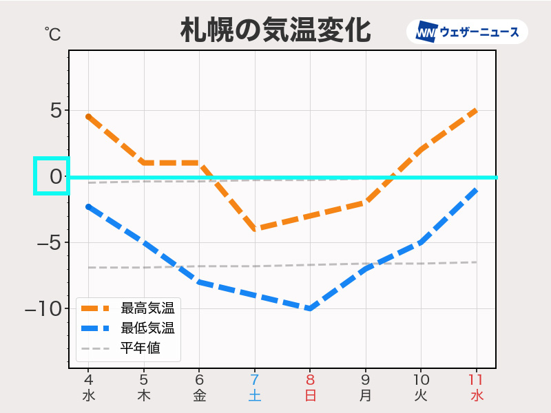 6日(金)にかけては、札幌市内ではプラスの気温が続くとみられます。週末は寒波の影響でグッと気温が下がりますが、期間終盤には再び気温が上昇します。