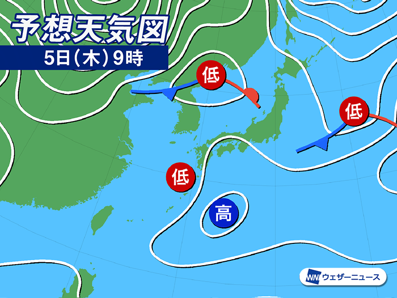 明日5日(木)は前線を伴った低気圧が近づく北日本で天気が崩れ、夜は広い範囲で雨や雪が降り出します。関東から近畿は高気圧に覆われ、穏やかな晴天となる見込みです。