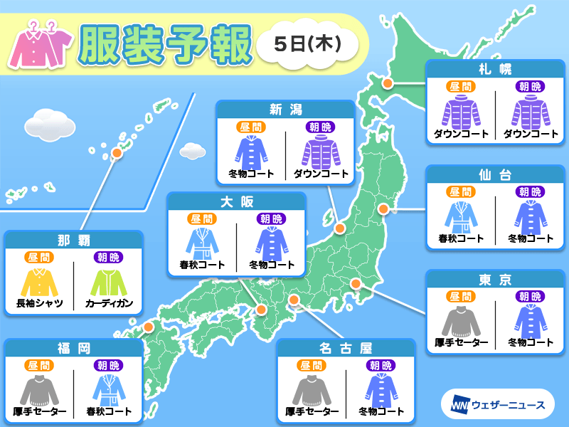 今日と明日の気温変化を比較して、気温に適した服装をご提案します。ウェザーニュースの服装予報もご活用ください。