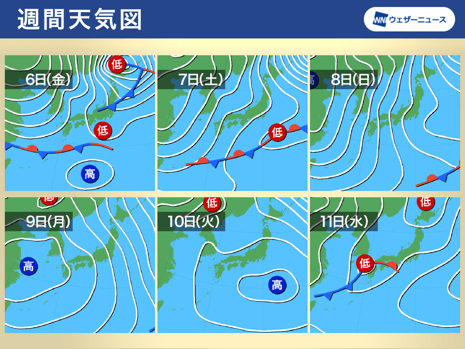 7日(土)からは冬型の気圧配置が強まり、8日(日)をピークに上空に強い寒気が流れ込む予想です。日本海側の地域を中心に大雪となる見込みで、積雪の急増や猛吹雪のおそれがあります。西日本の太平洋側でも強い雪の降る可能性があり、交通への影響が懸念されます。
