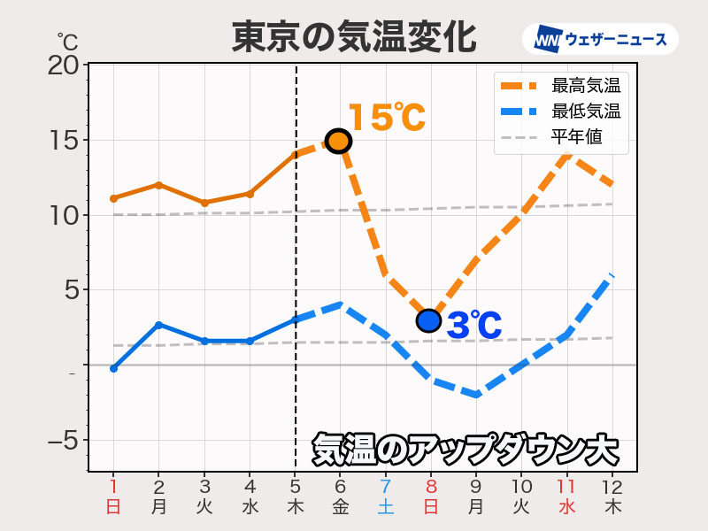 その後、週末には強い寒気の影響で気温が大幅に下がる見通しです。再び真冬の寒さとなるので、気温のアップダウンで体調を崩さないようお気を付けください。