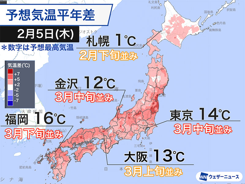 最高気温は昨日より高くなる予想の地点が多く、東京と名古屋は14℃で3月中旬並み、大阪は13℃で3月上旬並み、福岡は16℃で3月下旬並みと、各地で季節先取りの陽気となる見込みです。