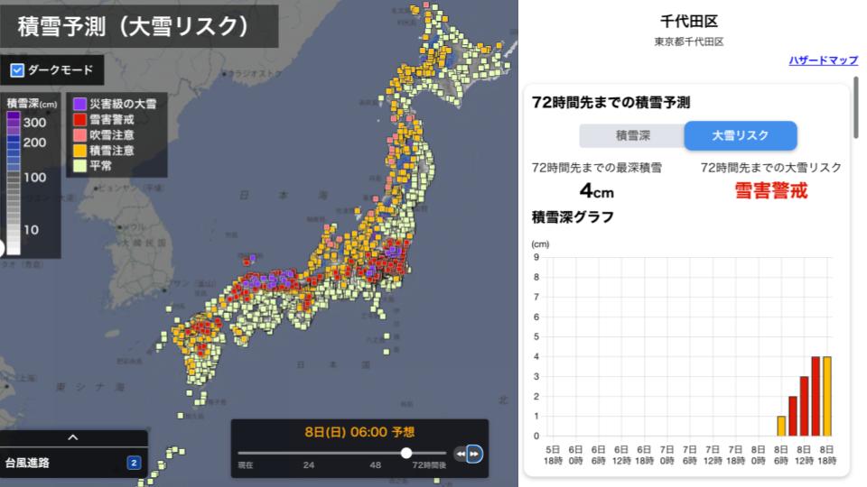 オプション機能「ダッシュボード」では、72時間先までの大雪リスクを一元的に確認することができます。