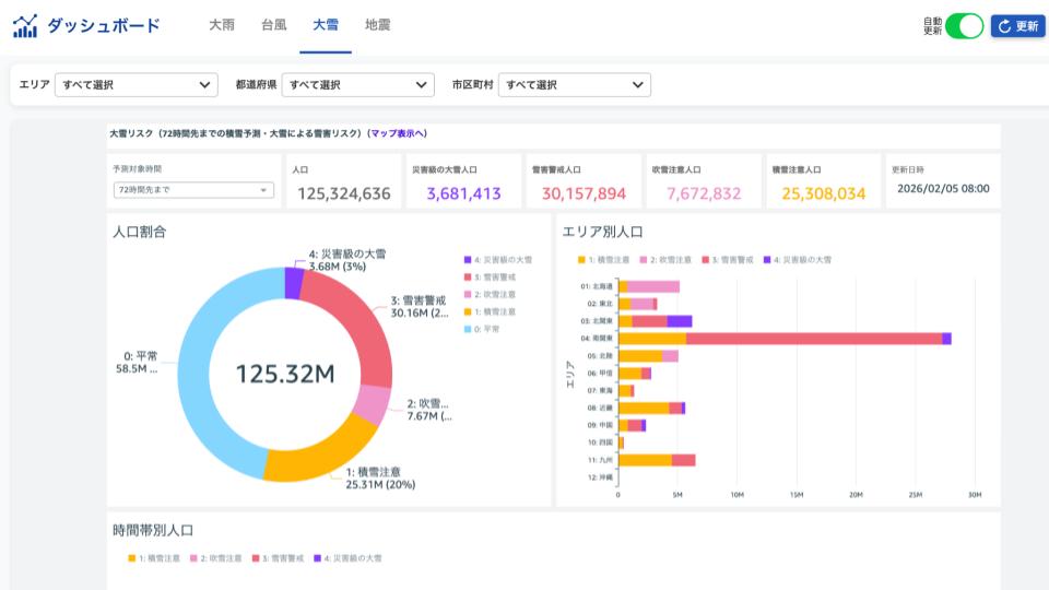 エリア別・時間帯別の大雪リスクの推移を一覧で把握できるダッシュボード機能を活用することで、的確な判断と事前対策を実現することが可能です。