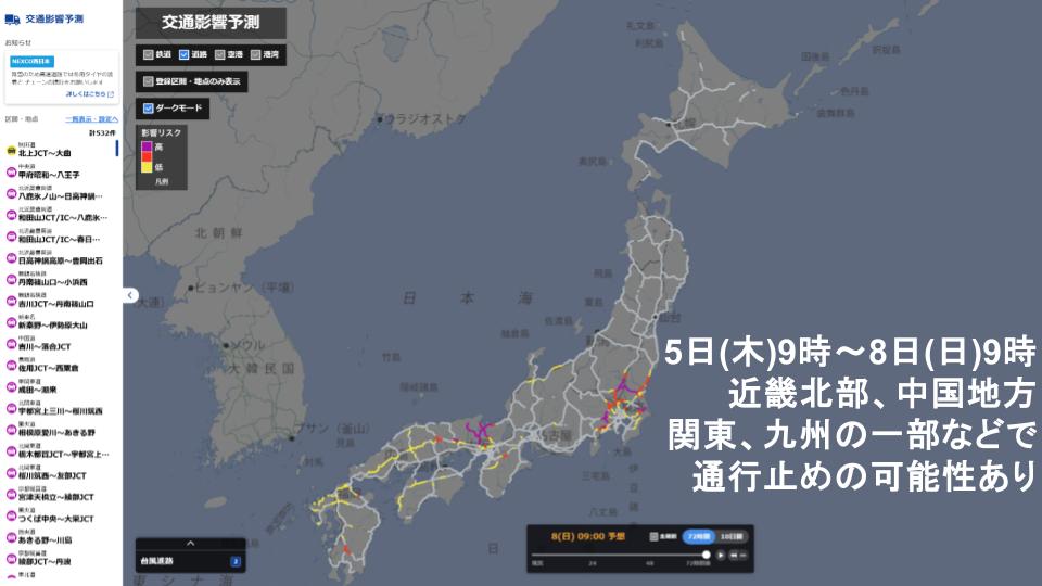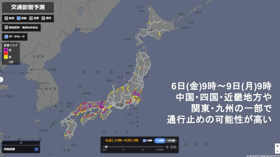 6日(金)時点で一連の大雪のピークが過ぎる9日(月)9時までの高速道路への影響リスクを確認すると、中国道や山陽道、近畿北部、普段雪の降らない四国など西日本太平洋側や関東の一部の路線で通行止めリスクの可能性を予想。