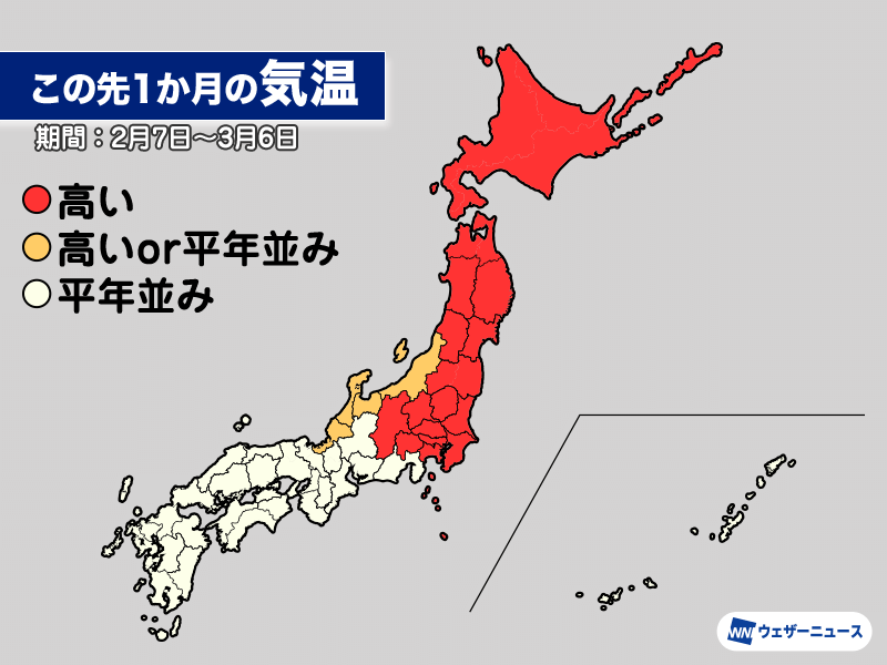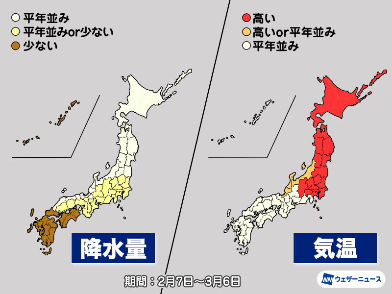 今日5日(木)、気象庁は2月7日から3月6日までの1か月予報を発表しました。2月中頃からは寒気の南下が弱まり、北日本や東日本を中心に気温が高くなります。春の訪れが早まりそうです。太平洋側は雨や雪の降りにくい傾向が続きます。