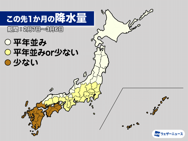 西日本から関東にかけては高気圧に覆われやすく、降水量は引き続き少なめの傾向となります。関東甲信から山陽は平年並みか平年より少なく、四国と九州、沖縄は平年より少なくなる見通しです。