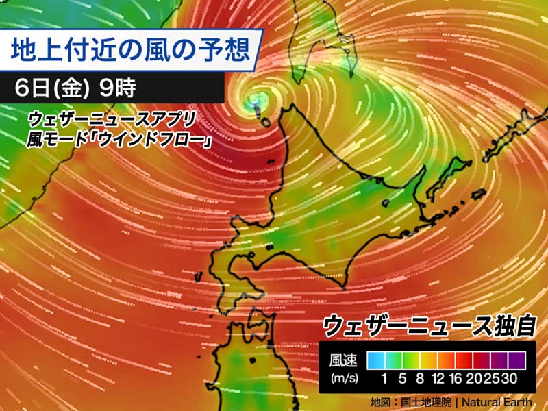 低気圧が急速に発達しながら通過するため、北海道は広い範囲で風が強まります。瞬間的には30m/s超の暴風となる所がある見込みです。