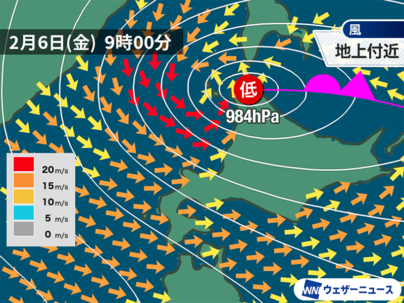 低気圧が急速に発達しながら宗谷付近を通過するため、北海道は広範囲で風が強まります。瞬間的には30m/s超の暴風となる所がある見込みです。