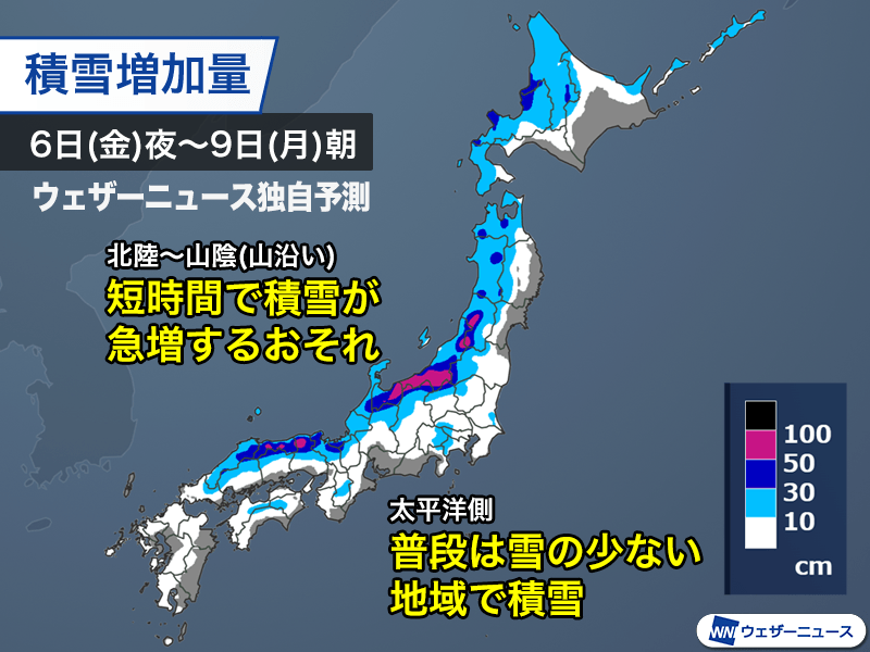 そのほかの山陰から北陸、北日本の日本海側は広い範囲で10〜30cmに達する見込みです。活発な雪雲が同じような所を通過した場合はさらに増える可能性があるため油断ができません。