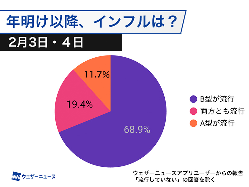 ウェザーニュースでは、2月3〜4日にアプリユーザーに対してインフルエンザの流行状況に関する調査を行いました。年明け以降、インフルエンザが流行していると回答した人のうち、68.9%がB型のみが流行、19.4%がA型・B型両方流行と回答。都道府県別に見ても、「流行していない」の回答を除くと全ての県で「B型のみが流行」と回答した割合が最も多い結果となりました。このことからも全国的にインフルエンザB型が流行していると言えそうです。(2026年2月3日〜4日 回答数:15715、選択肢:A型が流行/B型が流行/両方とも流行/流行していない)