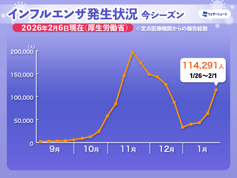 今日2月6日(金)、厚生労働省は2026年1月26日〜2月1日のインフルエンザ発生状況を発表しました。