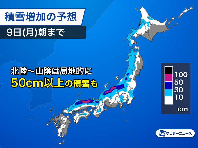 9日(月)には雪のピークは越えるものの、強い冷え込みが予想されるため積雪や路面凍結により交通への影響が続くおそれがあります。