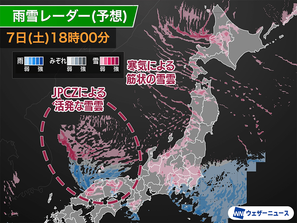 このあとは寒気の強まりとともに雨が雪に変わり、今夜にかけてJPCZの位置は東に移動して近畿北部や北陸でも雪の強まるところが増えてきます。