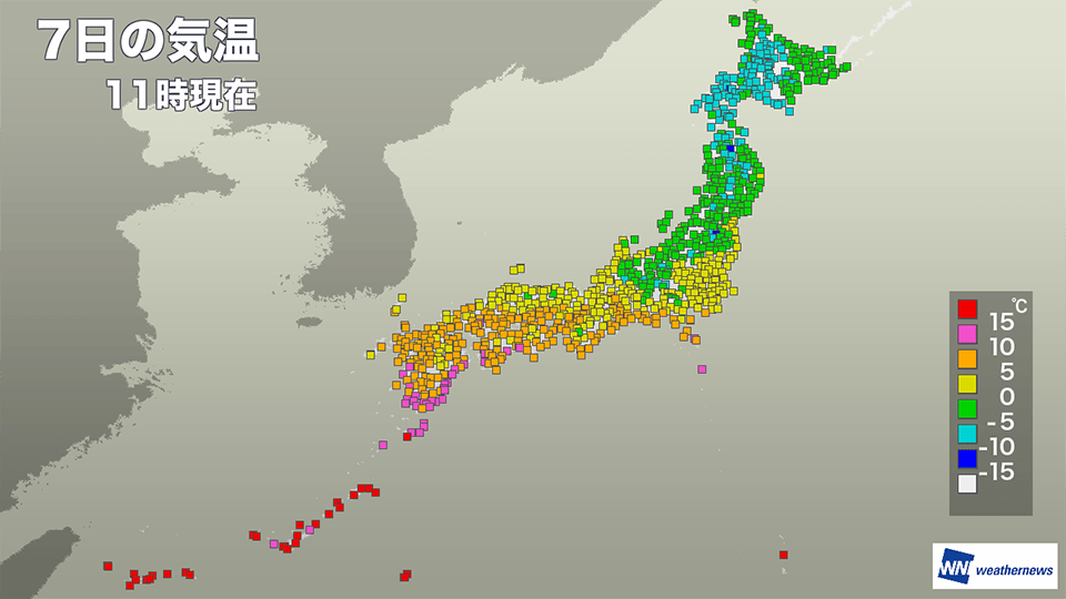 全国的に低温となっていて午前11時の時点では北日本や信越エリアのほぼ全域が氷点下となっています。
