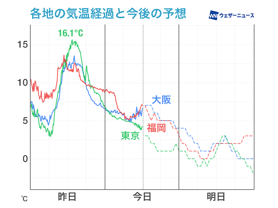 関東は前日差で10℃近く気温低下