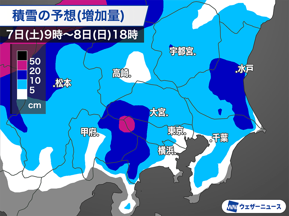 明日8日(日)夜までの積雪は、東京都心や横浜市、千葉市周辺で0〜5cm、さいたま市周辺で5〜10cm、水戸市周辺で10~20cm程度の予想となっています。