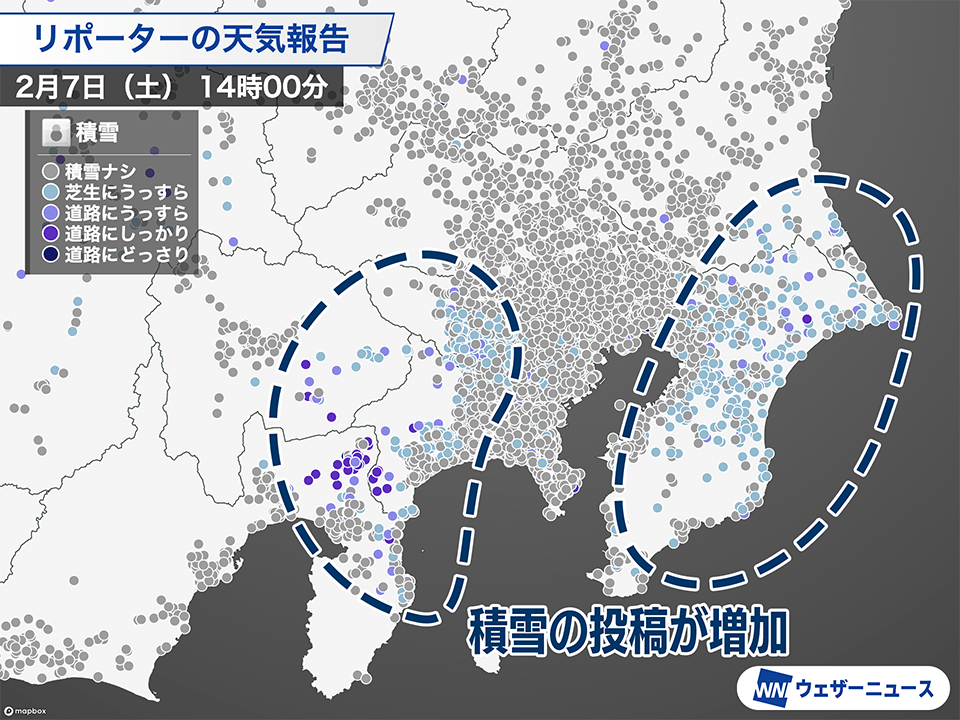 関東雪情報 東京都多摩南部や神奈川県西部、千葉県などでうっすら積雪