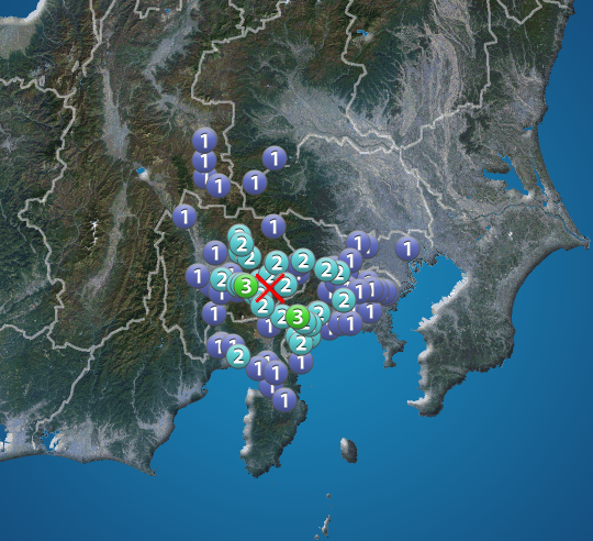 2月7日(土)20時01分頃、神奈川県と山梨県で最大震度3を観測する地震がありました。
