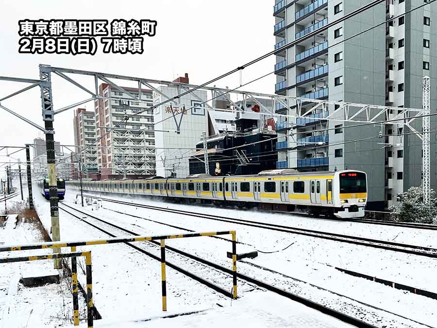 気温が低かったことで積雪状態となった所が多く、7時の積雪深(地面からの雪の厚み)は、東京都心で3cm、千葉で4cm、横浜で1cm、水戸で5cmなどとなっています。