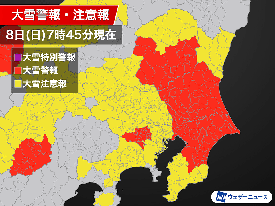 7時45分現在、千葉県、茨城県、栃木県の広範囲と東京都の一部に大雪警報が発表されています。
