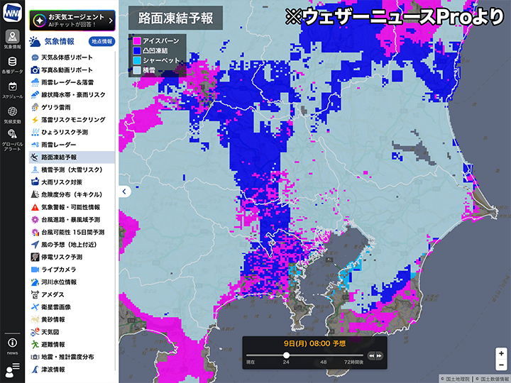 ウェザーニュースProで3日先までの1時間ごとの路面凍結予報を見る