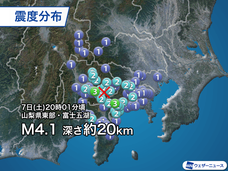 7日(土)20時01分頃、山梨県東部・富士五湖を震源とするマグニチュード4.1、深さ約20kmと推定される地震が発生しました。