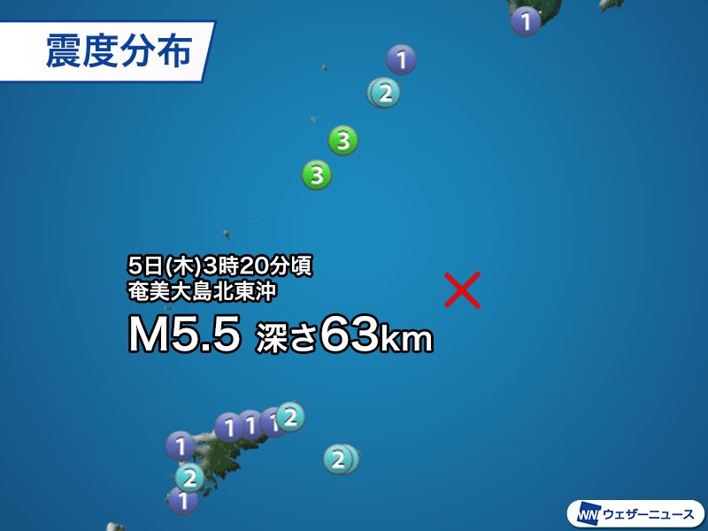 5日(木)3時21分頃、奄美大島北東沖を震源とするマグニチュード5.5、深さ63kmと推定される地震が発生しました。この地震で鹿児島県十島村・諏訪之瀬島と悪石島で最大震度3、奄美市や瀬戸内町などで震度2を観測しています。