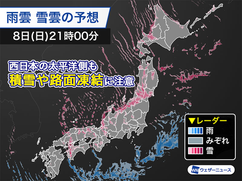 関東の雪は止んできましたが、西日本の太平洋側では今夜も雪の降りやすい天気が続きます。