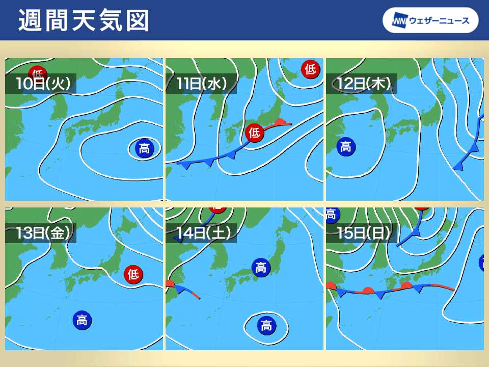 その後は天気が数日周期で変わり、週末には前線や湿った空気の影響で雲が増え、一部では雨の降る可能性があります。