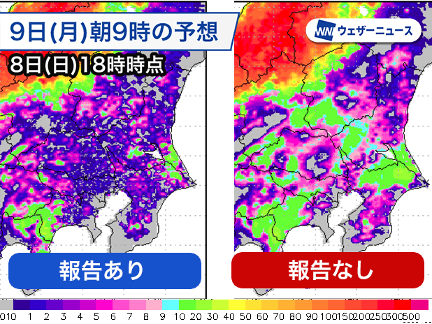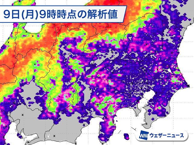 画像2は9日(月)9時時点の最新のユーザー報告で作られた解析実況値です。前日の夜の時点で「報告あり」で解析したものとだいぶ近いことがわかります。