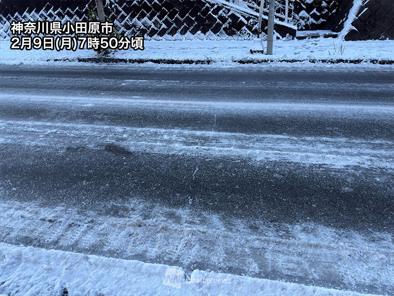 昨日8日(日)は強い寒気の影響を受け、太平洋側でも広い範囲で雪が降りました。今朝は強い冷え込みとなったため、路面の凍結しているところもあります。