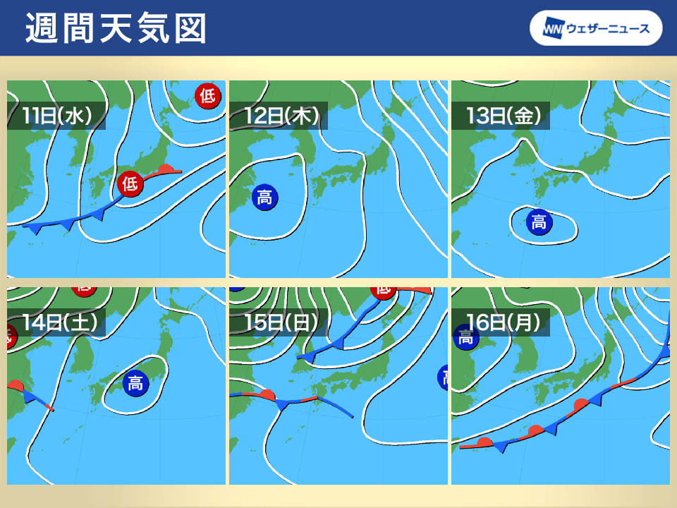 その後は天気が数日周期で変わり、週末には前線や湿った空気の影響で雲が増え、一部では雨の降る可能性があります。