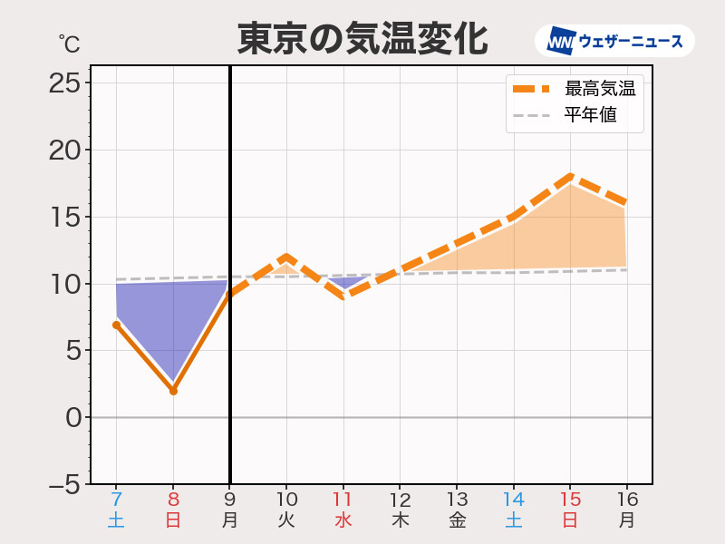真冬でもあまりない厳しい寒さのところから、週末にかけて次第に平年よりも気温が高くなる予想です。