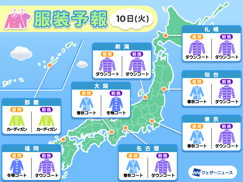 今日と明日の気温変化を比較して、気温に適した服装をご提案します。ウェザーニュースの服装予報もご活用ください。