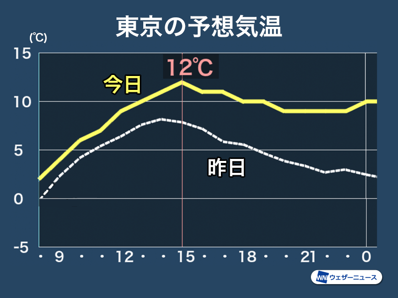 上空の寒気が北に退いているため、昼間は昨日よりも気温が上昇する見込みです。東京都心の気温の推移を見ると、この後は順調に気温が上がって昼過ぎには10℃に到達するとみられます。