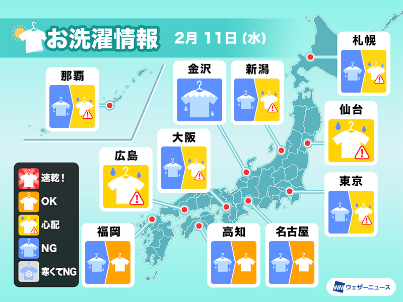ただ、西のエリアから天気が回復してくる見込みで、九州では朝の雨が止めば外干しするチャンス!沿岸部では風が強いので、洗濯物が飛ばされないようしっかり留めるのがおすすめです。