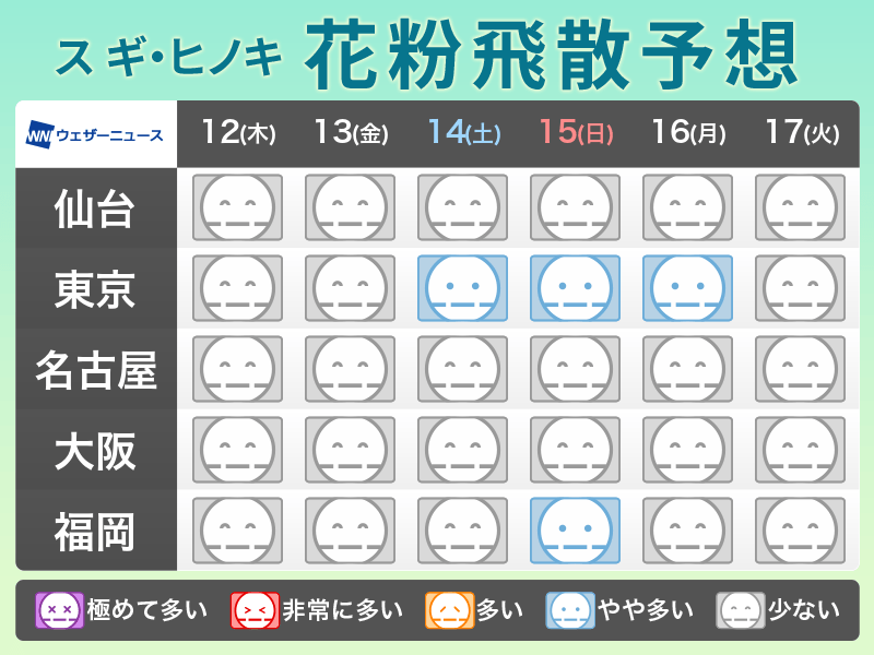 ただ、気温が上がると九州から関東にかけてはスギ花粉の飛散に注意が必要です。既に花粉が飛び始める時期で、風や気温上昇・雨上がりなどの条件次第では、一気に本格的な飛散が始まる可能性があります。花粉症の方は対策を行うようにしてください。