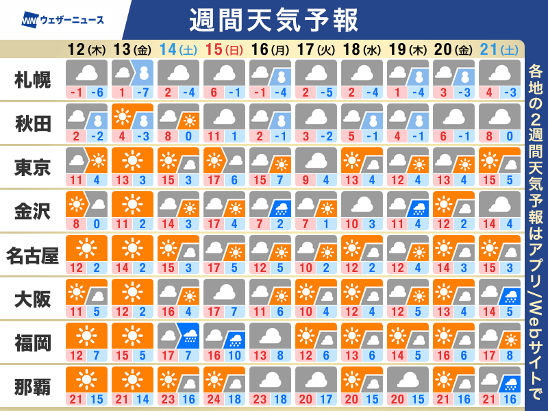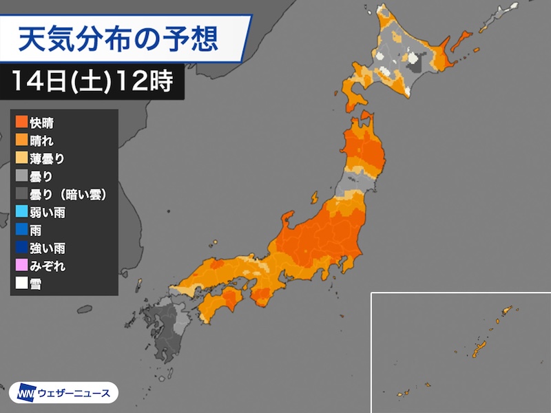 土曜は広く晴天 日曜は太平洋側も曇りや雨