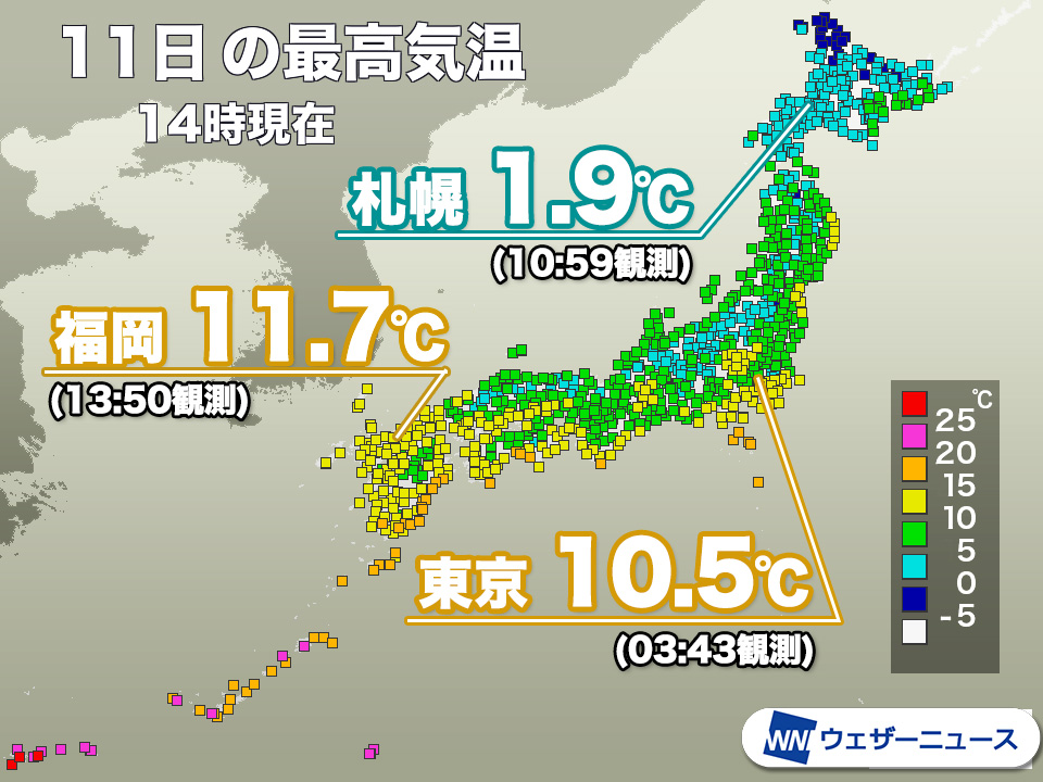 今日11日(水)14時までの最高気温は、福岡11.7℃、広島11.6℃、大阪9.3℃、名古屋9.6℃です。西日本や東海では朝の冷え込みは弱かったものの、昼間は日差しが少なく気温はそれほど上がりませんでした。